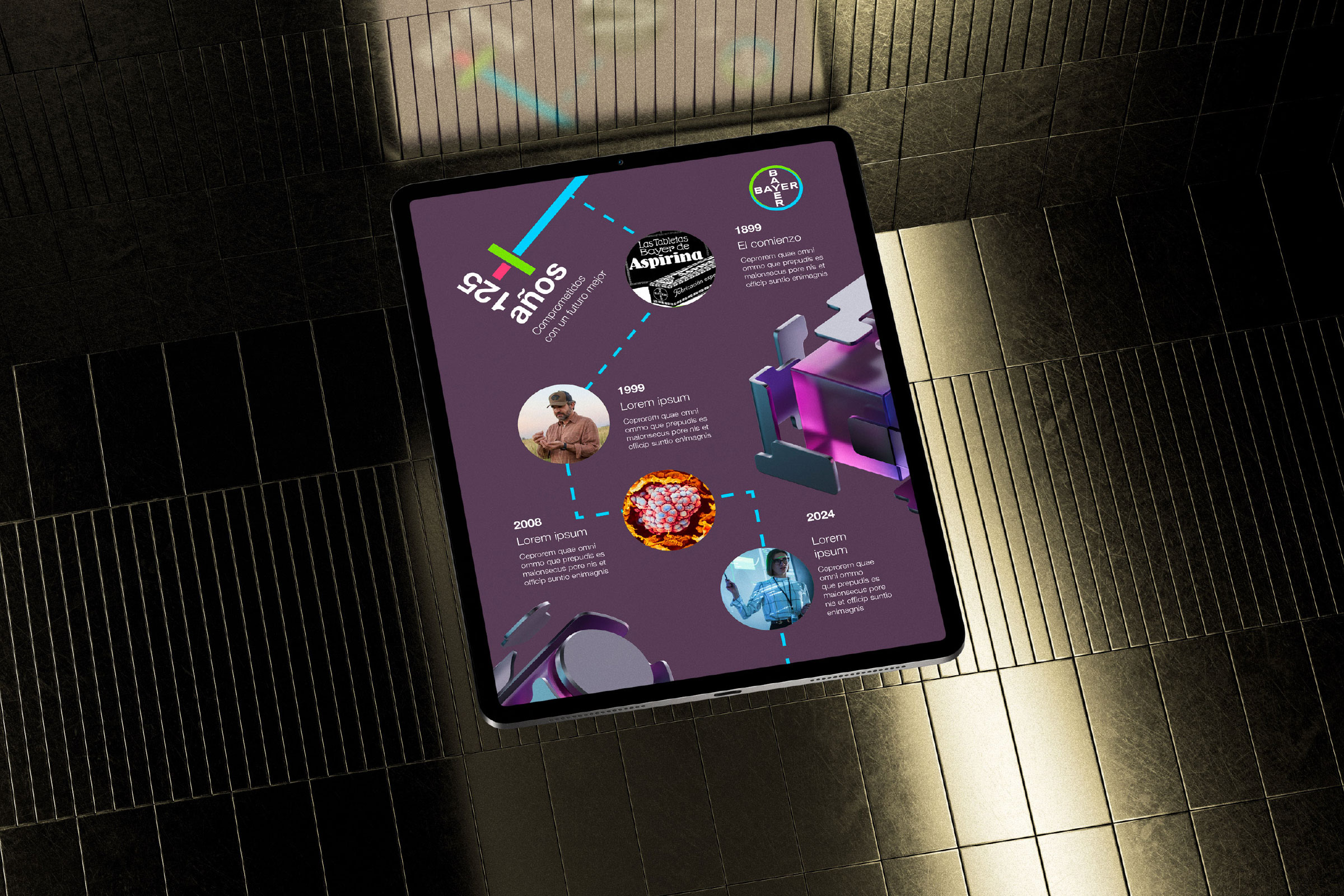 Para celebrar los 125 años de Bayer, desarrollamos una identidad conmemorativa que honra su legado científico mientras proyecta su visión de futuro. El reto consistía en crear un lenguaje visual capaz de convivir con la marca global, aportar un carácter propio al aniversario y, al mismo tiempo, transmitir innovación, confianza y continuidad.